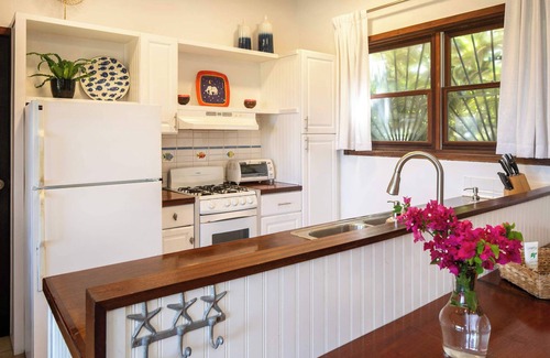 Cielo Vista features a fully-equipped kitchen designed to face the Great Room, allowing the chef and their helpers to enjoy the view and engage in social gatherings while preparing meals. Across from the kitchen, the large screened-in outdoor veranda offers a comfortable space for relaxing, reading, and dining. The veranda overlooks the private pool, which is perfect for sunbathing, sunset viewing, and enjoying drinks amid lush tropical flora.