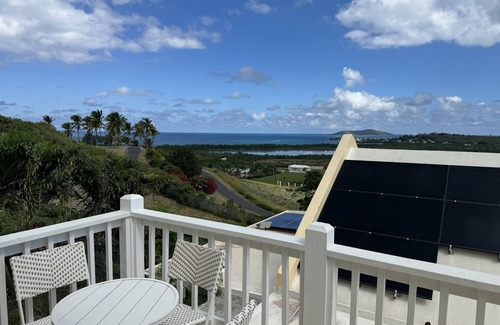 Newly built guest house in the premier beachfront neighborhood Shoys. Open and bright space with stunning views of the Caribbean Sea and Buck Island. Serene bedroom suite with king size bed, AC, walk in closet and bathroom. Enjoy dining under the stars on the balcony overlooking the rolling green hills and the turquoise waters. If you need extra space, the charming loft provides two extra beds and the living room has a pull out couch. Everything is new in the house and if you are bringing kids there are Magnatiles and other games to keep them entertained.