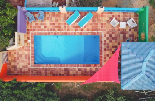 Welcome to Villa Sunrisa. This charming 2-bedroom 1 bathroom cottage, offers breathtaking views and a true family-friendly retreat. This cozy, breezy home features abundant outdoor spaces perfect for relaxation and entertainment. Enjoy large outdoor dining areas, a BBQ grill, fire pit, and spacious lounging couches. The large pool with it's expansive deck and built in bar is perfect for relaxing or entertaining island style. With its simple, inviting atmosphere, this property is designed for creating memories, offering serene island breezes and ample room for hosting. Ideal for gatherings, it combines comfort and natural beauty, making it the perfect vacation escape. What the house lacks in space, the outdoor area makes up for.